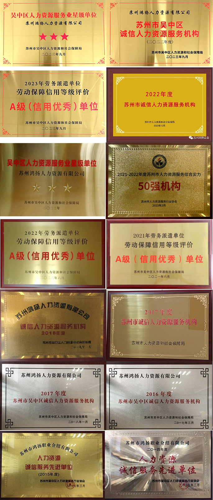 2016年度被評(píng)為蘇州市吳中區(qū)誠(chéng)信人力資源服務(wù)機(jī)構(gòu)
