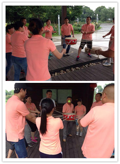 鼓動人心,同一小組的學(xué)員以一面鼓為圓心圍圈站好。鼓身周圍有長繩,鼓面上放一排球,全隊成員每人拽住一根繩子保持鼓面平衡,必須手握繩套部位,要求在鼓不落地,球不能落地的情況下將球在鼓面上顛50次。